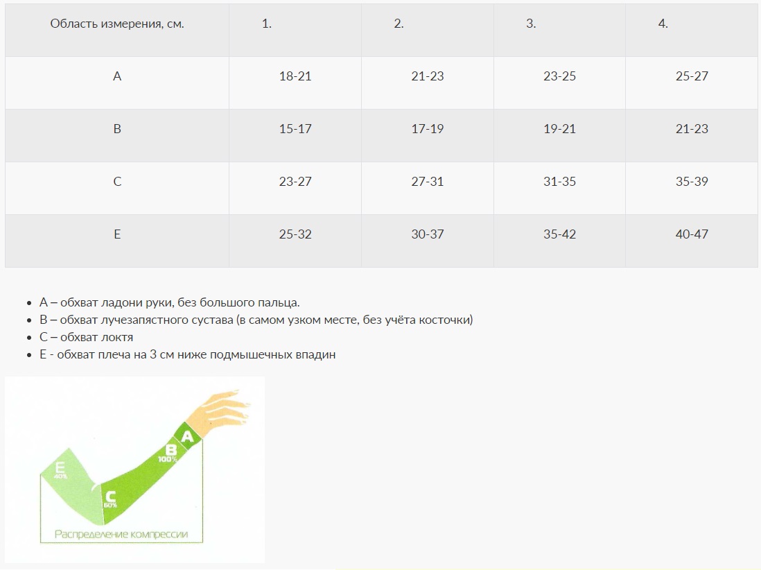 ВАЖНО! Измерение участков нужно проводить утром до появления отёчности на конечности. Размер изделия подбирать по таблице подбора типоразмеров. Компрессия на руке распределена градуировано, максимальное давление в области лучезапястного сустава, минимальное в области плеча.